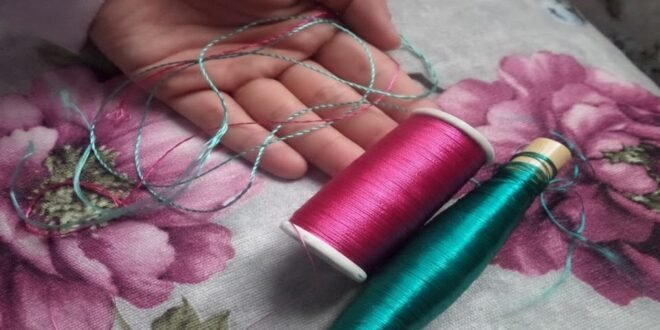 يعتبر بريم الحرير خطوة حرفية تتطلب دقة وصبر لضمان أن يكون الخيط جاهزًا للخياطة بأفضل شكل. الهدف من البريم هو تفتيل خيوط الحرير الخام (الصابرة) وفصلها ثم إعادة غزلها مرة أخرى بشكل محكم ومبروم. يتم شراء خيط الحرير عادةً على شكل “قصبة” (لفة) تتكون من عدة فتل (غالباً 4 فتل ). لبرم الخيط، اتبعي الخطوات التالية: