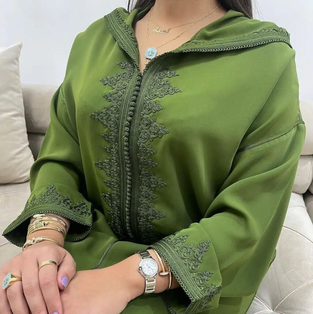 الأخضر الزيتي كيرمز للطبيعة والراحة، وهاد الشي علاش مطلوب بزاف فجلابات 2026. مناسب للنهار وللمناسبات العائلية، وكيتناسق مع بزاف من أنواع الخياطات التقليدية
